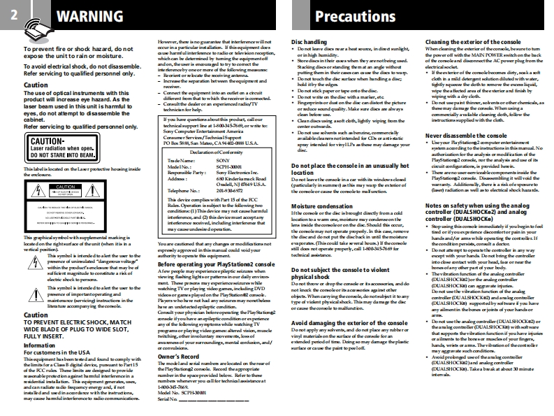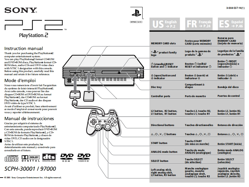 SONY3038537-141)口厂2TEnglishFrancaisEspanol→P.2→P.24→P.46PlayStation.2Ranuras paraFentes pour MEMORYMEMORY CARDMEMORY CARD slotsCARD (carte memoire)(tarjeta de mem oria)Instruction manualLogotipo dela familiaThank you for purchasing the PlayStation"是"productfamilyLogo de la gamme delogoproduits"B"de productos"B"computer entertainment system.You can play PlayStation2 format CD-ROMand DVD-ROM discs,PlyStationt format CD.Boton (/RESETROMdies,audio CDs and DVD video dics(standby)R ESETBouton (veillel/(espera/reinicio)ewith NTSC 1 designation with this console.button and indicat orRESETetindicateurindicadorBefore using this product,carefully read thismanul and retain it for future reference(open)buttonandBouton合owr)前etBoton(abri前eindicatorindicateur色indicadorMode d'emploiNous vous remercions d'avoir fait PacquisitionCompartiment adu syseme de loisir interactif PlayStationDisc traydi纠ueBandeja del discoAveccette console,vous pouve lire desdisques CD-ROM et DVD-ROMau formatPlyStation2,des CD-ROM au formatController portsPorts de manettePuertos de controlPlyStationt,des CD audio et des disquesDVD video de typeNTSC 1.Avant d'utiliser oe produit lisez attentivementce moded'emploi et conservezle pour pouvoirvous y reporter ulsrieurememt.L2 button.R2 button,Touche L2 touche R2Boton L2,boton R2L1 button,R1 buttontouche L1.touche R1boton L1,boton R1Manual de instruccionesGracias por adquirir elsistema deentretenimiento computar izado PlayStation2Directional buttonsTouches directionnellesBotones de direccionCon esta consola,puede reproducir DVDROMy CD-ROMde formato PlayStationt2,yCD.ROMde formato PlayStationt,y disoos de△,O,X,口buttonsTouches△,O,X,口Botones△.O.X.▣video DVD,CD audiocon l designacionNISC1.Touche STARTAntes deutilizar este producto,leSTART button(de mise en marche)Boton START (inicio)deenidamente este manual y conservel paraconsultarlo en el futuro.ANALOG mode buttonTouche de modeBoton modo ANALOGANALOG (analogique)(analogico)d写DOLBYdtsDVDDVDD I G I T A LDAE边SLE▣buttonTouche SELECTBoton SELECTVIDF O(de selection)(seleccion)SCPH-30001/97000Left analog stickManche analogiqueJoystick analogicoright analog stick.gauche.mancheizquierdo.JoystickL3 button,R3 buttonanalogique droit,analogico derecho,touche L3,touche R3boton L3 boton R3