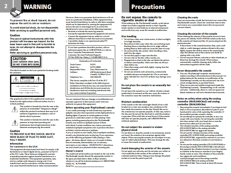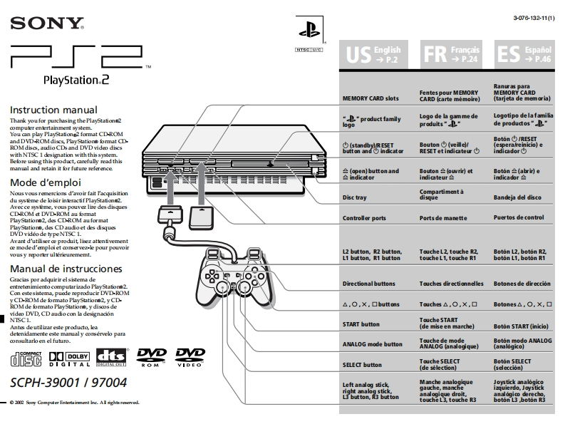 SONY3078-132111)口厂2TEnglishFrancaisEspanol→P.2→P.24→P.46PlayStation.2Ranuras paraFentes pour MEMORYMEMORY CARDMEMORY CARD slotsCARD (carte memoire)(tarjeta de mem oria)Instruction manualLogotipo dela familiaThank you for purchasing the PlayStation"B"product familyLogo de la gamme decomputer entertainment system.logoproduits"B"de productos"B"You can play PlayStation2 format CD-ROMand DVD-ROM discs,PlyStationt format CD.Boton (/RESETROMdises,audio CDs and DVD video dics(standbyl/R ESETBouton (veillel/(espera/reinicio)ewith NTSC 1 designation with this system.button and indicat orRESETetindicateurindicadorBefore using this product,carefully read thismanual and retain it for future reference(open)buttonandBouton合owr)前etBoton(abri前eindicatorindicateur色indicadorMode d'emploiNous vous remercions d'avoir fait PacquisitionCompartiment adu syseme de loisir interactif PlayStationDisc traydi纠ueBandeja del discoAvec ce syseme,vous pouve:lire des disquesCD-ROM e DVD-ROM au ormatPlyStation2,des CD-ROM au for matController portsPorts de manettePuertos de controlPlyStationt,des CD audio et des disquesDVD video de typeNTSC 1.Avant d'utiliser oe produit lisez attentivementce moded'emploi et conservezle pour pouvoirvous y reporter ulsrieurememt.L2 button.R2 button,Touche L2 touche R2Boton L2,boton R2L1 button,R1 buttontouche L1.touche R1boton L1,boton R1Manual de instruccionesGracias por adquirir elsistema deentretenimiento computar izado PlayStation2Directional buttonsTouches directionnellesBotones de direccionCon estesistema,puede reproducir DVD.ROMy CD.ROMde formato PlayStation2,yCD.ROMde formato PlayStationt,y disoos de△,O,X,口buttonsTouches△,O,X,口Botones△.O.X.▣video DVD,CD audiocon l designacionNISC1.Touche STARTAntes deutilizar este producto,leaSTART button(de mise en marche)Boton START (inicio)detenidamente este manualy conservel paraconsultarlo en el futuro.ANALOG mode buttonTouche de modeBoton modo ANALOGANALOG (analogique)(analogico)d泻能DOLBYdtsDVDDVDD I G I T A LDAE边Touche SELECTBoton SELECTVIDF OSLE▣button(de selection)(seleccion)SCPH-39001/97004Left analog stickManche analogiqueJoystick analogicoright analog stick.gauche.mancheizquierdo.JoystickL3 button,R3 buttonanalogique droit,analogico derecho,touche L3,touche R3boton L3 boton R3