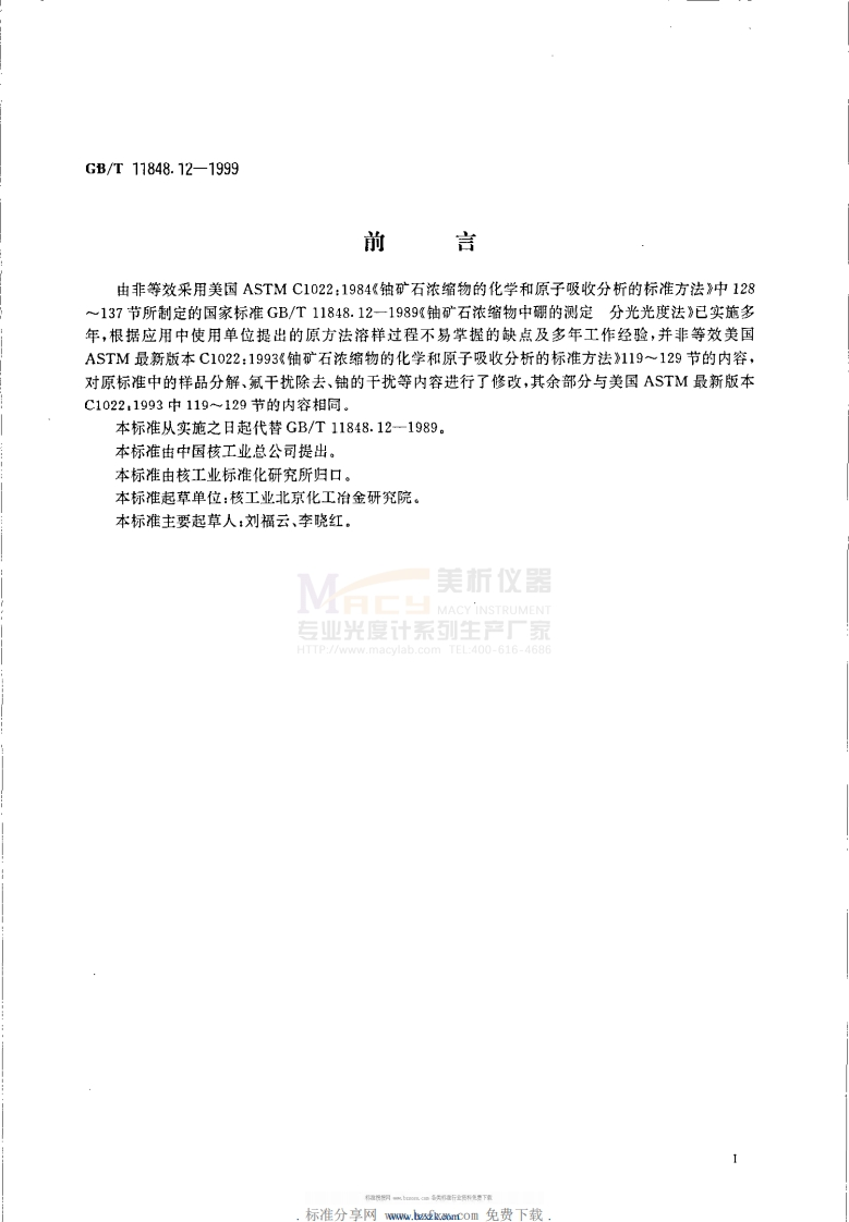 GBT11848.12-1999铀矿石浓缩物中硼的测定分光光度法348072@abc4个月前发布关注私信0.18MB6页037GBT11848.12-1999铀矿石浓缩物中硼的测定分光光度法此内容为付费资源,请付费后查看¥15¥23黄金会员免费钻石会员免费立即购买您当前未登录!建议登陆后购买,可保存购买订单付费资源 第1页 / 共6页 第2页 / 共6页 试读已结束,还剩4页,您可下载完整版后进行离线阅读 THE END标准规范 文本预览 18627.12030中华人民共和国国家标准GB/T11848.12-1999铀矿石浓缩物中硼的测定分光光度法Determination of boron in uranium ore concentrateby spectrophotometry1999-05-19发布1999-12-01实施国家质量技术监督局发布机悦额Lm名天建行士色料使怎下重www.bzxzk.com 查看更多 收起部分 喜欢就支持一下吧收藏