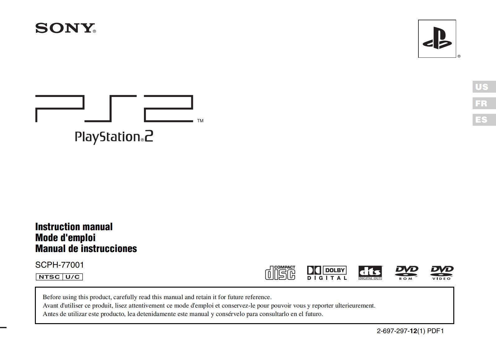 SONYBUS口厂FRESPlayStation.己Instruction manualMode d'emploiManual de instruccionesSCPH-77001dD☑DOLBYdtsDVDDVDNTSC U/CDIGITALDIGITAL OUTROMVIDEOBefore using this product,carefully read this manual and retain it for future reference.Avant d'utiliser ce produit,lisez attentivement ce mode d'emploi et conservez-le pour pouvoir vous y reporter ulterieurement.Antes de utilizar este producto,lea detenidamente este manual y conservelo para consultarlo en el futuro.2-697-297-12(1)PDF1