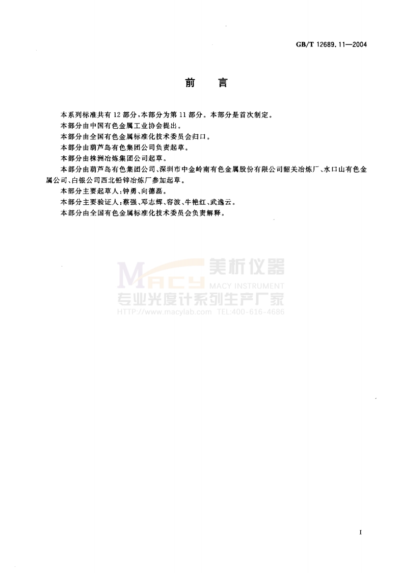 1CS77.040.30H13GB中华人民共和国国家标准GB/T12689.11-2004锌及锌合金化学分析方法镧、铈合量的测定三溴偶氮胂分光光度法The methods for chemical analysis of zinc and zinc alloys-The determination of lanthanum and cerium contents-The tri-bromide arsenazo spectrophotometric method2004-04-30发布2004-10-01实施中华人民共和国国家质量监督检验检疫总局中国国家标准化管理委员会发布