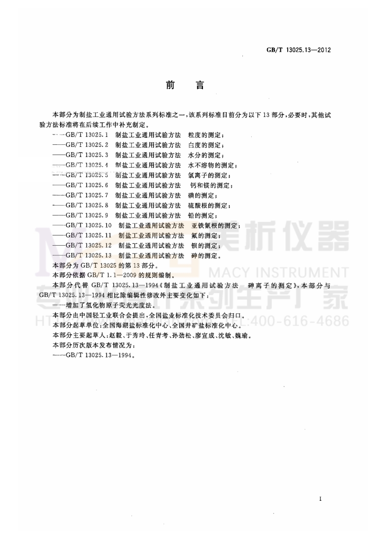 1CS71.060.50X35中华人民共和国国家标准GB/T13025.13-2012代替GB/T13025.13-1994制盐工业通用试验方法砷的测定General test method in salt industry-Determination of arsenicMACY INSTRUMENT业光度计系列生产厂家HTTP://www.macylab.com TEL:400-616-46862012-06-29发布2012-12-01实施中华人民共和国国家质量监督检验检疫总局中国国家标准化管理委员会发布