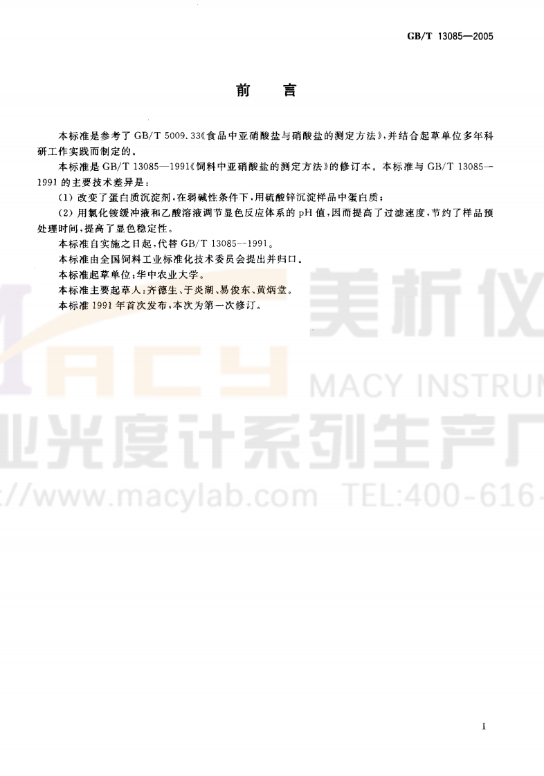 1Cs65.120B46G中华人民共和国国家标准GB/T13085-2005代替GB/T13085-1991饲料中亚硝酸盐的测定比色法Determination of nitrite in feed-Method using colorimetric analysisINSTRU卫光度计系列生产//www.macylab.com TEL:400-6162005-09-05发布2006-02-01实施中华人民共和国国家质量监督检验检疫总局中国国家标准化管理委员会发布