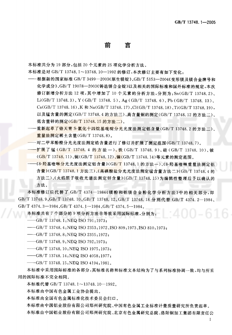 1CS77.120.20H12B中华人民共和国国家标准GB/T13748.1一2005代替GB/T13748.1一1992镁及镁合金化学分析方法铝含量的测定RUChemical analysis methods of magnesium and magnesium alloys-Determination of aluminum content卫光度(NEQ IS0791:1973)//www.macylab.com TEL:400-6162005-07-26发布2006-01-01实施中华人民共和国国家质量监督检验检疫总局中国国家标准化管理委员会发布