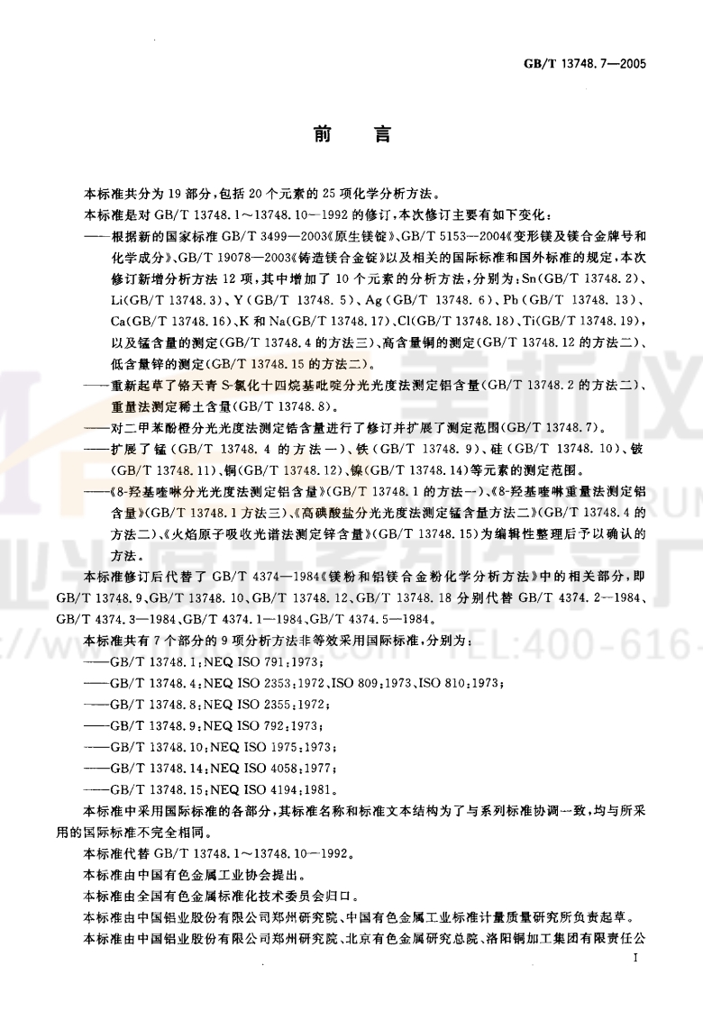 1CS77.120.20H12中华人民共和国国家标准GB/T13748.7-2005代替GB/T13748.3-1992镁及镁合金化学分析方法锆含量的测定二甲苯酚橙分光光度法INSTRUChemical analysis methods of magnesium and magnesium alloys-Determination of zirconium content-Xylenol orange spectrophotometric method//www.macylab.com400-6162005-07-26发布2006-01-01实施中华人民共和国国家质量监督检验检疫总局中国国家标准化管理委员会发布