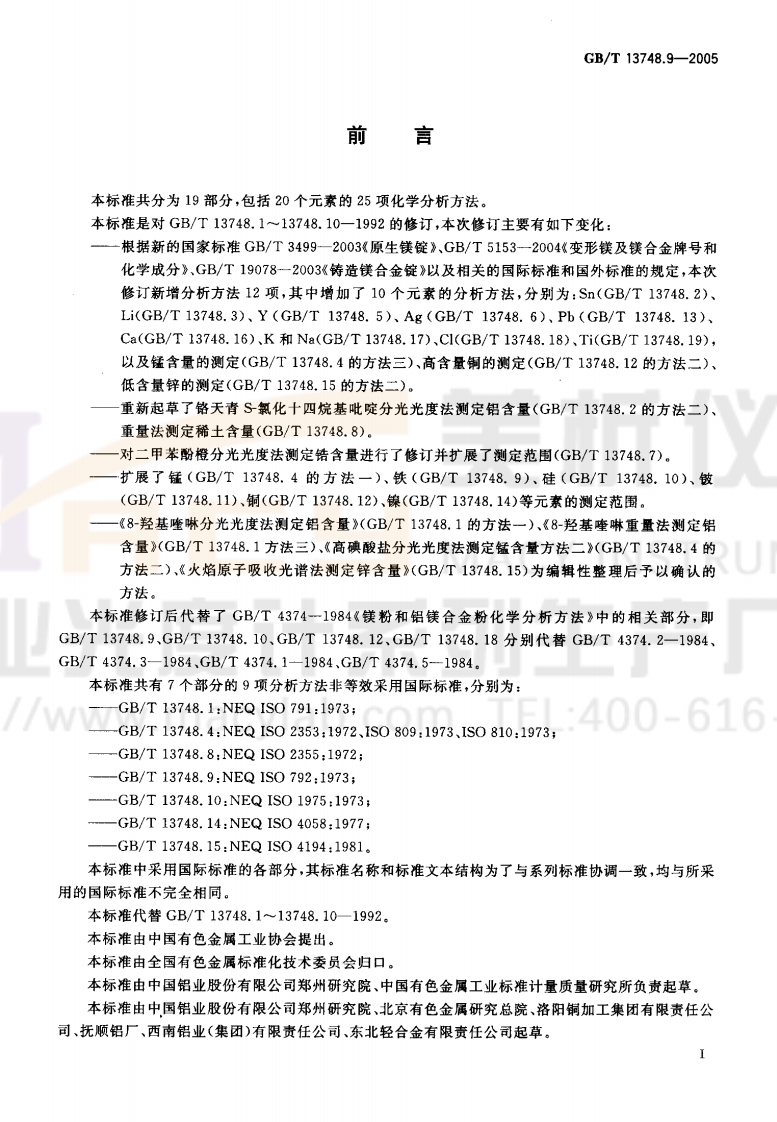 1CS77.120.20H12中华人民共和国国家标准GB/T13748.9-2005代替GB/T13748.5-1992.GB/T4374.2-1984镁及镁合金化学分析方法铁含量的测定邻二氮杂菲分光光度法NSTRUChemical analysis methods of magnesium and magnesium alloys-Determination of iron contentOrthopenanthroline spectrophotometric method//www.macylEL:400-616(NEQ ISO792:1973)2005-07-26发布2006-01-01实施中华人民共和国国家质量监督检验检疫总局中国国家标准化管理委员会发布