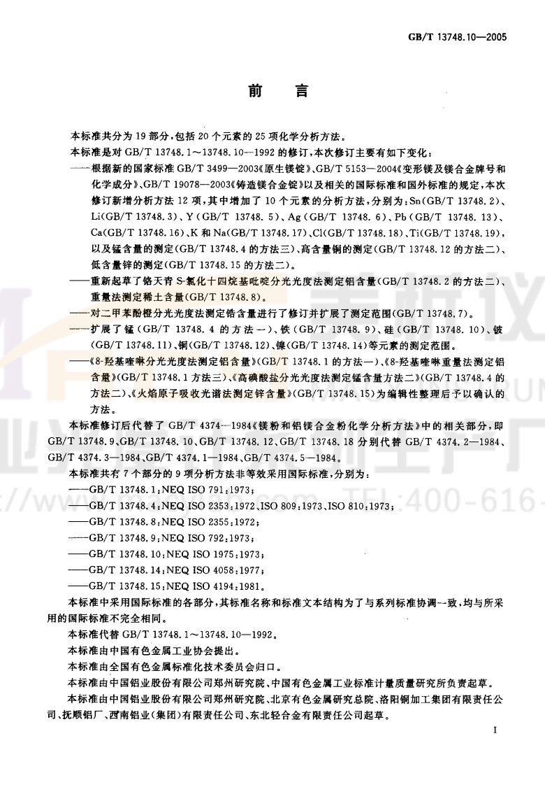 ICS77.120.20H12中华人民共和国国家标准GB/T13748.10-2005代替GB/T13748.6-1992、GB/T4374.3-1984镁及镁合金化学分析方法硅含量的测定钼蓝分光光度法Y INSTRUChemical analysis methods of magnesium and magnesium alloys-Determination of silicon content-Molybdenum blue spectrophotometric method//www.macylEL:400-616(NEQ IS01975:1973)2005-07-26发布2006-01-01实施中华人民共和国国家质量监督检验检疫总局中国国家标准化管理委员会发布