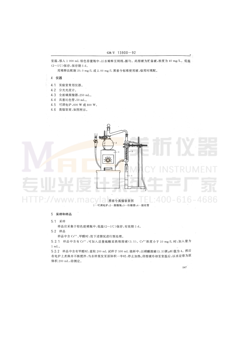 中华人民共和国国家标准水质黑索今的测定GB/T13900-92分光光度法Water quality-Determination ofRDX-Spectrophotometry1主题内容与适用范围1,1主题内容本标准规定了测定水质中黑索今的分光光度法。1.2适用范围1.2.1本标准适用于弹药装药工业废水中黑常今含量的测定。12.2对50mL试料,比色丘光程10mm,黑素今的最低检出浓度为0.05mg/L,测定范围为Q.1~10.0mg/L.1.2.3在被测溶液中如有环四甲撑四硝胺(奥托今),对黑索今测定有干扰。·2原理系索今在硫酸溶液中加热分解生成甲醛,甲醛与乙酰两刚及氨作用,生成黄色的3,5二乙酰基)ME门-1,4-二氢卢别啶,在412mm处进行分光光度测定。3试剂■除另有说明,分析中所用试剂均应符合国家标准分析纯试剂。所用水均使用蒸馏水或同等纯度的水。3.1浓硫酸:P=1.84g/mL.HTTP:32乙酰丙期溶液。acylab.COmTEL:400-616-46863.2.1称取25g乙酸钱溶于80mL水中,加冰乙酸(p=1.05g/mL)3mL,以水稀释至100mL,此溶液为pH6缓冲溶液,3.2.2吸取0.2mL乙酰丙酮试剂加入上运(32.1)pH6缓冲溶液中,摇匀。低温下保存,有效期为一个月,3.3硝酸溶液:50%(V/W).量取10mL硝酸(p=1.39g/mL)与10mL水混合。3.4统酸亚铁铵[FeSO,·(NH,)2·SO,·6HO]。3.5硫酸亚快铵溶液:10g/L。称取1.3g六合水硫酸亚铁铵(3.4)溶于100mL水中.3.6黑常今标准溶液。准确称取精制黑索今(经丙酮重结品二次)0.0400g于1000mL烧杯中,以约10mL丙酮溶解后,缓缓加入预先加热的水约800mL,置沸水浴中加热。使其溶解后,继续如热至无丙酮气味。取出冷却至国家环境保护局1992-12-02批准1993-09-01实施546