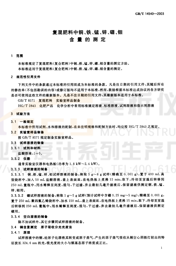 GB/T14540-2003前言本标准代替GB/T14540.1一1993《复混肥料中钼的测定方法硫氰酸钠分光光度法》、GB/T14540.2一1993《复混肥料中曬的测定方法甲亚胺-H酸分光光度法、GB/T14540.3一1993《复混肥料中钰的测定方法》、GB/T14540.4一1993《复混肥料中锌的测定方法》。本标准与GB/T14540.1~GB/T14540.4一1993相比主要变化如下:一一增加了对铜、铁含量的测定方法,并对钼、锰、锌测定方法中试验溶液的制备统一采用稀盐酸提取。本标准由中国石油和化学工业协会提出。本标准由全国肥料和土壤调理剂标准化技术委员会归口。本标准起草单位:上海化工研究院、中国-阿拉伯化肥有限公司。本标准主要起草人:商照聪、王连军、章明洪、杨晓霞、沙燕萍、杜显兰、金志强,本标准于1993年首次发布。MACY INSTRU光度计系列生产/www.macylab.com TEL:400-616