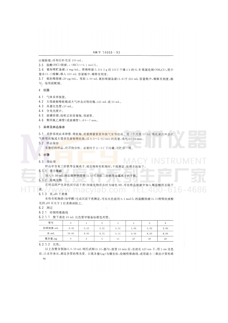 中华人民共和国国家标准空气质量氨的测定GB/T14668-93纳氏试剂比色法Air quality-Determination of ammonia-Nessler's reagent colorimetric method1主题内容与适用范围1.1主题内容本标准规定了测定工业废气及空气中氨的钠氏试剂分光光度法」本标准适用于制药,化工、炼焦等工业行业废气中氨的测定。在吸取被体积为50ml.,采样体积为2.5~10L.时,测定范围为0.5一800mg/m2.对于浓度更高的样品,测定以前必衡进行稀释。当样品溶液总体积为50mL.,采样体积10L时,最低检出限为0.25mg/m2原理用稀硫酸溶被吸收氨,以铵离子形成与钠氏试剂反应生产黄棕色络合物,该络合物的色度与氨的含量成正比,在420nm波长处进行分光光度测定3试剂MACY INSTRUMENT分析时只使用符合国家标准或专业标准的分析纯试剂和按3.】制备的水。31水,无氨,按下述方法之一制备。3.1.1离子交换法将蒸馏水通过一个强酸性阳离子交换树脂(氢型)柱,流出液收集在磨口袁璃瓶中。每升流出液中加入10g同类树脂,以利保存。HTTP:3.1.2蒸馏法在1000mL燕馏水中,加入0.1mL硫酸(3.2),并在全鼓璃蒸馏器中重蒸馏,弃去前468650mL馏出液,然后将约800mL馏出液收集在磨口鼓璃瓶中,每升收集的馏出液中加入10g强酸性阳离子交换树脂(氢型),以利保存。3.2硫酸吸收液:疏酸,e=1.84g/mL,c(HS0,)-0.005mo1/L。3.3纳氏试剂:称取12g氢氧化钠(NaOH),溶于60mL水中,冷至室温。称取1.7g二氟化汞(HgCl)溶解在30mL.水中。称取3.5g碘化钾(KI)于10mL水中。在搅拌下,将二氯化汞溶被慢慢加入碘化钾溶液中,直至形成的红色沉淀不再溶解为止。在搅拌下,将冷的氢氧化钠溶液缓慢地加入到上述二氯化汞和碘化钾的混合液中。再加入剩余的二氯化汞溶液,于暗处静置24,倾出上清液,储于棕色瓶中,用橡皮寒塞紧。于冰箱中保存,可稳定一个月。3.4酒石酸钾钠溶液:称取50g消石酸钾钠(KNaC.H,O,·4H,O),溶于100mL水(3.1)中加热煮沸国家环境保护局1993-09-18批准1994-05-01实施75