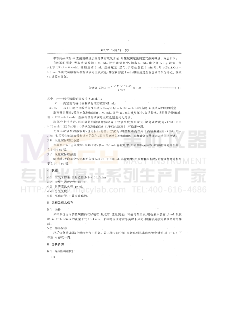 中华人民共和国国家标准空气质量氨的测定次氯酸钠-水杨酸分光光度法GB/T14679-93Air quality-Determination of ammonia-Sodium salicylate-sodium hypochlorite spectrophotometric method1适用范围1.1本标准规定了氨的次氯酸钠-水杨酸分光光度测定法12本标准适用于恶臭源厂界及环境空气中氨的测定,1.3测定范围:在吸收被为10mL,采样体积为10一20L时,测定范围为0.008一110mg/m3,对于高浓度样品测定前必须进行稀释。1.4最低检出限:本方法检出限为0.1g/10mL.,按(22LS计算):当样品吸收液总体积为10mL,采样体积为10L时,最低检出浓度0.008mg/m3。1.5干扰:有机胺浓度大于1mg/m3时不适用。2原理氨被稀硫酸吸收液吸收后,生成硫酸铵,在亚硝基铁氯化钠存在下,铵离子、水杨酸和次氯酸钠反应生成蓝色化合物,根据颜色深视,用分光光度计在697m波长处进行测定。NSTRUME门门3试剂分析中所用试剂全部为符合国家标准的分析纯试剂:使用的水为无氨水,其制备方法见3.1条。3.1无氨水制备按下述方法进行。HTTP:在100L燕馏水中,加入浓H,S0,01nL,并在全破装僧器中裁馏,弃去前50mL馏出液,收集468其后馏出部分。收集的无氨水按每升10g比例加入强酸型阳离子交换树脂,以利保存。3.2疏酸吸收液硫酸溶液c(1/2HSO,)=0.005mol/L3.3水杨酸-酒石酸钾溶液称取10.0g水杨酸C,H,(OH)COOH置于150mL.烧杯中,加适量水,再加入5mol/1.氢氧化钠溶液15mL,搅拌使之完全溶解,另称取10.0g酒石酸钾钠(KNaC,H,O。·4H,O).溶解于水,加热煮沸以除去氨,冷却后,与上述溶液合并移入200mL容量瓶中,用水稀释到标线,摇匀。此溶液pH=6.0一6.5,贮于棕色瓶中,至少可以稳定一个月。3.4亚硝基铁氰化钠溶液称取0.1g亚硝基铁氰化钠{Na:Fe(CN),NO)·2H,O),置于10mL具塞比色管中,加水至标线摇动使之溶解。临用现配。3.5次氯酸钠溶液国家环境保护局1993-09-18批准1994-03-15实施113