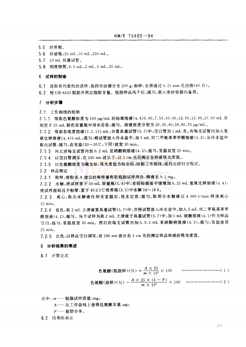中华人民共和国国家标准饲料中色氨酸测定方法GB/T15400-94分光光度法Determination of tryptophan in feedstuffs-Spectrophotometry1主题内容与适用范围本标准规定了测定饲料中色氨酸的原理和方法,本标准适用于配合饲料、混合饲料、浓缩饲料和单一饲料。2引用标准GB6433饲料粗脂肪测定方法3原理美析仪器饲料中蛋白质经碱水解后,降解成多肽和游离的氨基酸,在酸性介质中,氧化剂存在下,色氨酸引哚环与对二甲氨基苯甲醛反应生成蓝色化合物,在一定范围内颜色深浅与色氨酸含量成正比。4试剂HTTP://www.macylab.com TEL:400-616-4686除注明者外均为分析纯。水为蒸馏水。4.1硫酸(GB625)溶液、c(1/2HS0,)=21.2mol/L址取589mL.硫酸徐徐加入约350mL水中,冷却后用水稀释至1L。4.21%对二甲氨基苯甲醛溶液:1.0g对二甲氨基苯甲醛溶于21.2mol/L硫酸(4.1)中并定容100mL。4.30.2%亚硝酸钠(GB633)溶液(m/W)。4.410%氢氧化钾(GB2306)溶液(m/W)。4.51色氨酸,色谱纯。4.6L-色氨酸标准溶液:准确称取25.0mgL-色氨酸于小烧杯中,加少量0.1mol/八.氢氧化钾溶液使之溶解,定量地转移到250mL棕色容址瓶中,用水定容,浓度为1004g/mL。注:本标准溶液4℃冰箱中保存,一个月内使用,浓度不变。5仪器、设备5.1分析天平:感量0.1mg。5.2分光光度计。5.3离心机:转速4000r/min。5.4实验室用粉碎机。国家技术监督局1994-12-30批准1995-07-01实施216