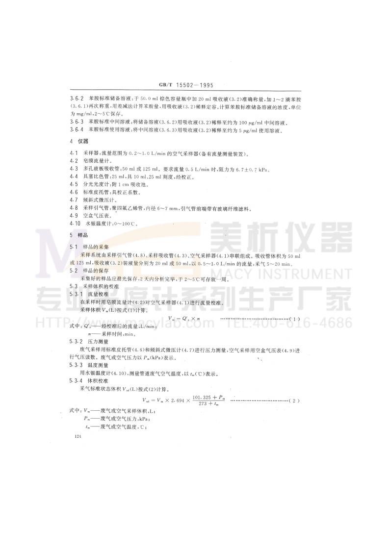 中华人民共和国国家标准空气质量苯胺类的测定盐酸萘乙二胺分光光度法GB/T15502-1995Air quality-Determination of aniline-N-(1-naphthyl)ethylene diamine dihydrochloridespectrophotometric method1主题内容及适用范围1.1主题内容本标准规定了测定工业废气和环境空气中苯胶(芳香伯胺)类化合物的盐酸蒸乙二胺分光光度法。1.2适用范围1.2.1本方法适用干制药、染料等行业排放废气中苯胺(芳香伯胺)类化合物的测定。1.2.2在采样体积为0.5~10.0L时,吸收效率达99%,剩定范围为0.5一600mg/m31.2.3当苯胺浓度为10g/10ml时,共存NH:的含量不大于400mg,NO,含量不大于3mg时,无明显干扰。2原理苯胺气体经硫酸溶液吸收后,在pH2一3和15一20C的条件下,经亚硝酸钠重氮化,过址的亚硝MENT钠用氨基磺酸铵除去,苯胺重氮化后与盐酸萘乙二胺偶合生成紫红色化合物,在波长550m处反应式如下:NH,N-NTOSO《N=N]+OsOH-+CH,·NHCH,CH,·NH·2HCHTTP://WWW.N.c.n.NHG.C.NH,.G+H0-616-46863试剂除非另有说明,分析时均使用符合国家标准的分析纯试剂和按3.1茶制备的水3.1不含有机物的蒸馏水:加少量高锰酸钾的碱性溶液于水中,再行蒸馏即得(在整个蒸馏过程中水应始终保持红色,否则应随时补如高锰酸钾)。3.2吸收液:c(1/2HS0,)=0.01mcl/L硫酸溶液3.3亚硝酸钠(NaNO)溶液:0.25g/100ml,临用现配。34氨基磺酸铵(NH,SO,NH2)溶液:2.5g/100ml,2~一5℃保存,使用一周,3.5盐酸萘乙二胺(CHN·2HC1)溶液:0.75g/100ml,过滤后使用,2~5℃保存一周.3.6苯胺标准溶液:3.6.1苯胺提纯:苯胶(C,H,NH2)重蒸馏,取184一186C馏分国家环境保护局1995-03-15批准1995-08-01实施