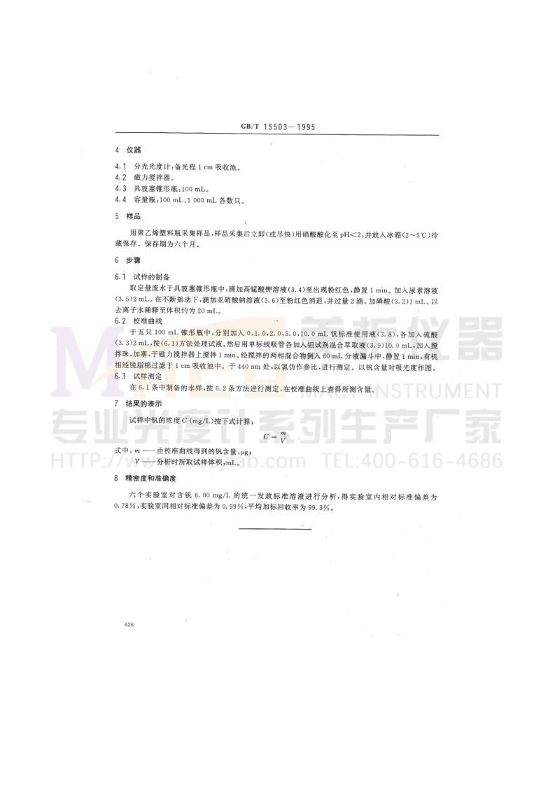 中华人民共和国国家标准水质钒的测定GB/T15503-1995钽试剂(BPHA)萃取分光光度法Water quality一Determination of vanadium一BPHA extraction spectrophotometric method1主题内容和适用范围1.1主题内容本标准规定了测定水和废水中钒的钽试剂萃取分光光度法。1.2适用范围1.2.1本方法适用于水和废水中钒的测定1.2.2测定范围:使用1cm吸收池,本方法检测限为0.018mg/L,测定上限10.0mg/L。若测定浓度大于上限,分析前可将样品适当稀释2原理钽试剂(N-苯酰-N-苯胲),(缩写BPHA)为弱酸,在强酸性介质中可与五价钒形成一种微溶于水的桃红色整合物,反应方程式如下,C-OH.C-C-0 0 0-N-CH:V05+2+2H+42H.0RUMENT-N-OHH,C-N-O 0-C-C.H该整合物能定量地被三氯甲烷和乙醇混合液搅拌萃取,在440nm处,分光光度法测定。3试剂除非另有说明,分析时均使用符合国家标准的分析纯试剂,去离子水或同等纯度水。HTTP:/31酸Hs0p:卧m你度0.616-46863.2磷酸(H,PO,):P=1.69g/mL3.3硫酸:(1+1).34高锰酸钾溶液0.5g/100ml.。称取0.5g高锰酸钾,溶于100ml.水中。3.5尿紫溶液:40g/100m1。称取40g尿素,溶于100mL水中.3.6亚硝酸钠溶液:0.5g/100mL。称取0.5g亚硝酸钠,溶于100ml.水中.3.7饥标准贮备液:P=0.1000mg/mL。准确称取偏钒酸按0.2296g·溶于水中,加入硫酸(3.3)2mL,溶解后移入10G0mL.容量瓶中,用水稀释至刻度,摇匀.3.8钒标准使用液:P-10.0g/mL.址取100mL钒标准贮备液(3.7)稀释于1000mL.容量瓶中至刻度。3.9组试剂-三氯甲烷,乙醇混合萃收剂。称取0.5g但试剂于50mL乙醇和200mL三氯甲烧的溶液中,贮于干燥的250mL试剂瓶中,国家环境保护局1995-03-15批准1995-08-01实施625