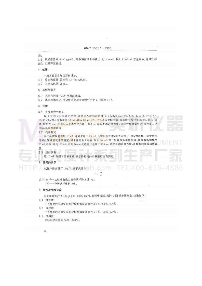 中华人民共和国国家标准水质,肼的测定GB/T15507-1995对二甲氨基苯甲醛分光光度法Water quality-Determination of hydrazine-p-Dime-tylaminobenzaldehyde spectrophotometric method1主题内容和适用范围1.1主题内容本标准规定了测定水中肼的对二甲氨基苯甲醛分光光度法。1.2适用范围1.2.1本标准适用于地而水和工业废水中肼的测定。1.2.2试料体积1~10ml,比色皿光程为1.5cm时,本方法检测限以群计为0.002mg/L,测定上限为1.00mg/L。更高浓度的样品,稀释后料进行测定。1.2.3干扰:氨基联、硫脲,脲素分别高达20.50.200mg/L以上时干扰测定:一甲基肼为肼含量的3倍以上NO:大于1mg/L时产生干扰。2原理在酸性溶液条件下,群与对二甲氨蕃苯甲醛作用,生成对二甲氨基苄连氯黄色化合物,于波长小458nm处进行分光光度测定ENT试剂除非另有说明,本标准所用试剂均为符合国家标准或专业标准的分析纯试剂,试验中均应使用蒸馏水或同等纯度的水。HTTP:/3.1盐酸(HCl):p=1.19g/mL.。32盐酸落液,aHc=1maL.b.C0mTEL:400-616-46863.3乙醇95%。3.4对二甲氨花苯甲醛溶液:称取4g对二甲氨基苯甲醛溶于200mL.95%乙醇和20 mL HCI[3.1]酸中。3.5叠氮化钠溶液:155g/L,称取不含耕的叠氯化钠(NaN,注意刷)15.5g溶干水中,稀释至100ml.如叠氨化钠中含耕,可按下述步骤精制:将叠氯化钠溶于适量水中,滤去不溶物,滤液置烧杯中,将烧杯放在电热板上加热,不断授拌,使叠氨化钠结品析出,待大部分叠氨化钠析出后,用滤纸过滤,经无水乙醇脱水后,将此叠氢化钠放入烘箱中于105土2C干燥2,放在干燥器内冷却,然后放入试剂瓶中备用。注意:叠氢化钠剧毒,精制操作应在通风柜内进行。3.6肼标准贮备溶液:100mg/L。称取0.3280盐酸群(N,H,·2HCI)或0.4060g硫酸肼(N,H:·H,SO,),用HC1溶液[3.2]溶解,定量移入1000mL容量瓶中,并用HCI[3.2]稀释至标线备国家环境保护局1995-03-15批准1995-08-01实施637