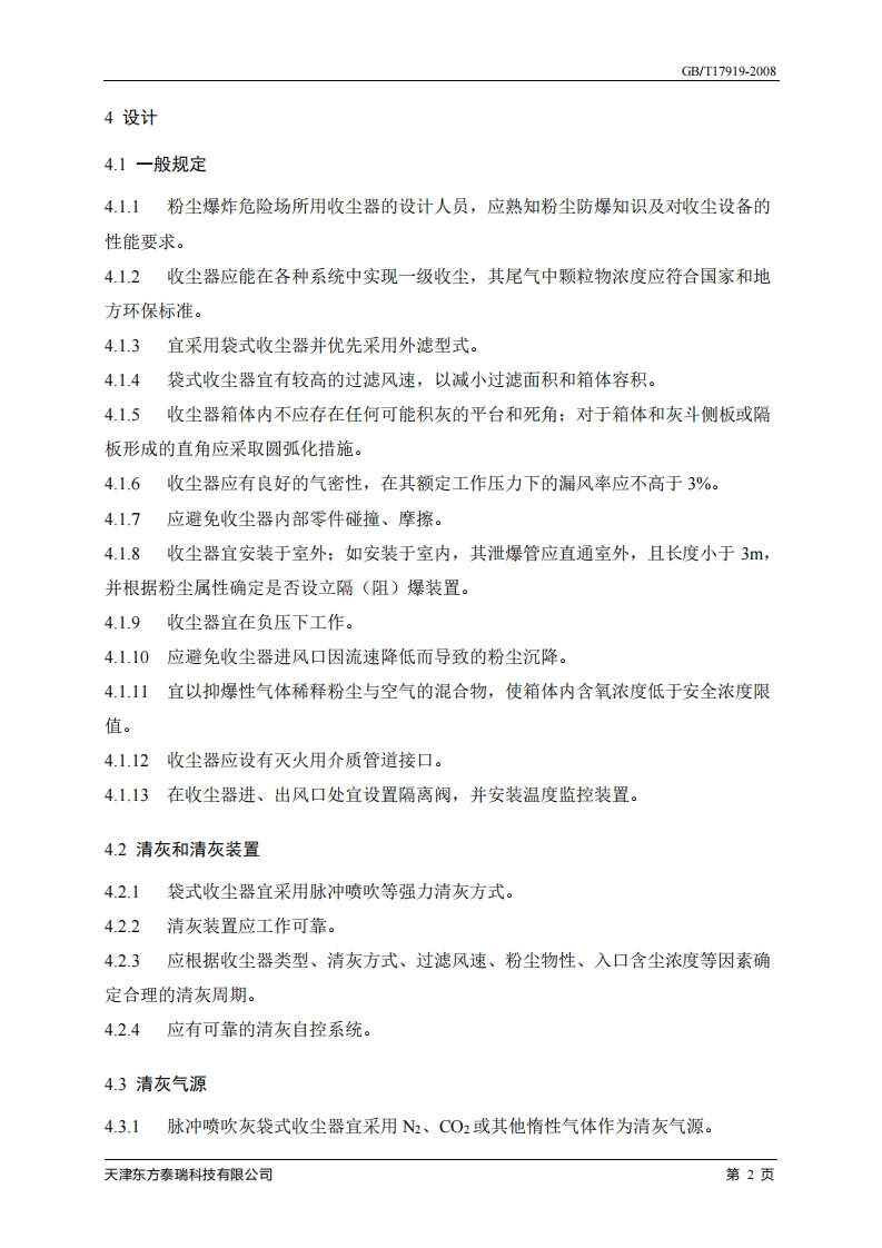 GB/T17919-2008粉尘爆炸危险场所用收尘器防爆导则1范围本标准规定了粉尘爆炸危险场所用收尘器的防爆要求。本标准适用于粉尘爆炸危险场所用收尘器的设计、安装、使用与维护。本标准不适用于矿山井下、烟花爆竹及民用爆炸器材生产场所。2规范性引用文件下列文件中的条款通过本标准的引用而成为本标准的条款。凡是注日期的引用文件,其随后所有的修改单(不包括勘误的内容)或修订版均不适用于本标准,然而,鼓励根据本标准达成协议的各方研究是否可使用这些文件的最新版本。凡是不注日期的引用文件,其最新版本适用于本标准。GB12476.1可燃性粉尘环境用电气设备第1部分:用外壳和限制表面温度保护的电气设备第1节:电气设备的技术要求(idt GB12476.1-2000,EC61241-1:1999)GB15577粉尘防爆安全规程GB/T15604粉尘防爆术语GB/T15605粉尘爆炸泄压指南3术语和定义GBT15604中确立的以及下列术语和定义适用于本标准。3.1粉尘爆炸危险场所dust explosion hazardous area存在可燃粉尘、助燃气体和点燃源的场所。3.2粉尘爆炸危险场所用收尘器dust collectors in dust explosion hazardous area在粉尘爆炸危险场所用于捕集气固两相流中固体颗粒物的设备。天津东方泰瑞科技有限公司第1页