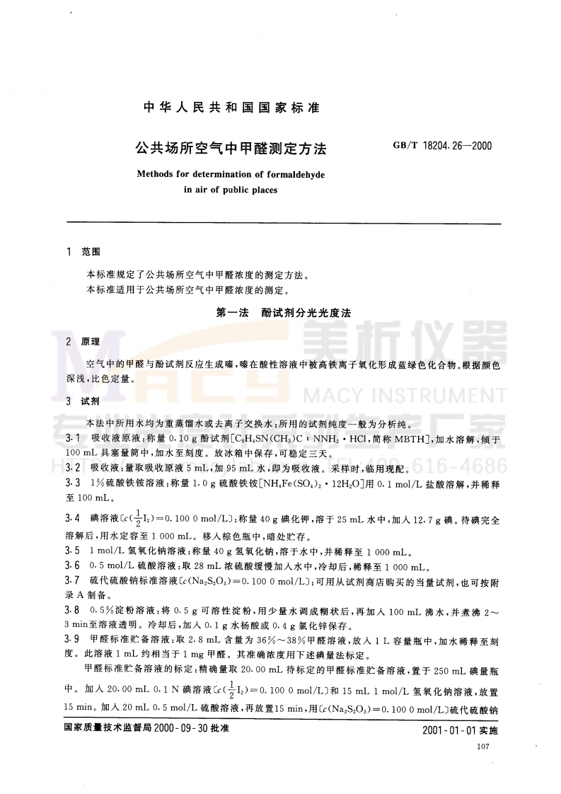 GB/T18204.26-2000前言为贯彻执行《公共场所卫生管理条例》和GB9663~9673一1996、GB16153一1996《公共场所卫生标准》,加强对公共场所卫生监督管理,特制定本标准。本标准中的方法是与GB9663~9673一1996、GB16153一1996相配套的监测检验方法。本标准第一法为仲裁法。本标准为首次发布。本标准的附录A是标准的附录。本标准的附录B是提示的附录。本标准由中华人民共和国卫生部提出。本标准起草单位:武汉市卫生防疫站、辽宁省卫生防疫站。一4爬生摄怎队话品生王玖子技我及男款清清天来e一MACY INSTRUMENT专业光度计系列生产厂家HTTP://www.macylab.com TEL:400-616-4686106