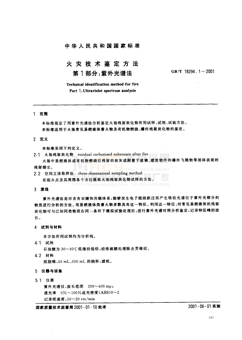 GB/T18294.1-2001前言火灾原因鉴定是公安业务的重要组成部分。多年来火灾原因技术鉴定工作主要以其他行业专业标准或自建方法守则为依据。为了更科学、快速、准确地进行火灾原因技术鉴定,为社会公共安全服务,作为法律依据特制定此标准。该标准的制定主要借鉴了法国香精香枯油紫外光谱测定法标准和美国高分子材料ABS中苯乙烯紫外光谱定量标准。本标准的附录A为提示的附录。本标准由中华人民共和国公安部提出。本标准由全国消防标准化技术委员会归口。本标准起草单位:公安部天津消防科学研究所。本标准主要起草人:歌惠民、孙平。本标准于2001年1月首次发布。本标准委托公安部天津消防科学研究所负责解释。ME美析仪器MACY INSTRUMENT专业光度计系列生产厂家HTTP://www.macylab.com TEL:400-616-468616