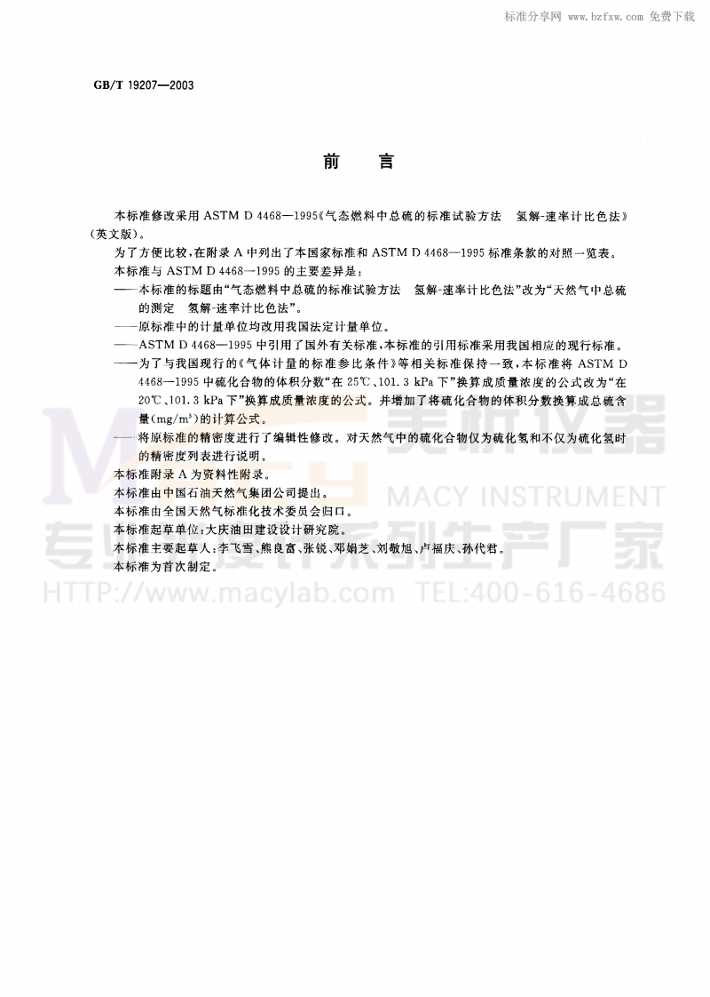 1Cs,75.060E24中华人民共和国国家标准GB/T19207-2003天然气中总硫的测定氢解-速率计比色法Natural gas-Determination of total sulfur contentRUMENT专业黑一厂家HTTP://www.macylab.com TEL:400-616-46862003-06-18发布2003-12-01实施中华人民共和国国家质量监督检验检疫总局发布
