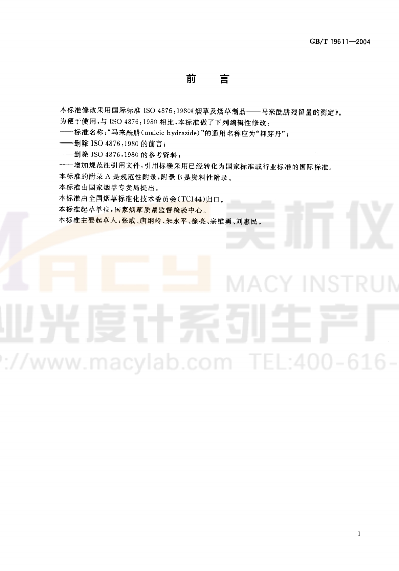 ICS65.160X87GB中华人民共和国国家标准GB/T19611-2004烟草及烟草制品抑芽丹残留量的测定紫外分光光度法Tobacco and tobacco products-Determination of maleic hydrazide residues-UV spectrophotometer method业光度(IS04876:1980,MOD)生产//www.macylab.com TEL:400-6162004-12-14发布2005-03-01实施中华人民共和国国家质量监督检验检疫总局中国国家标准化管理委员会发布