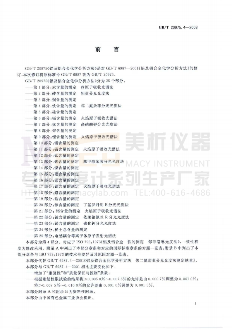 1CS77.120.10H12中华人民共和国国家标准GB/T20975.4-2008代替GB/T6987.4一2001铝及铝合金化学分析方法第4部分:铁含量的测定邻二氨杂菲分光光度法TRUMENTMethods for chemical analysis of aluminium and aluminium alloys-Part 4:Determination of iron content-P://WWOrthopenanthroline photometric method616-4686(ISO 793:1973,Aluminium and aluminium alloysDetermination of iron-Orthophenanthroline photometric method,MOD)2008-03-31发布资料专用章2008-09-01实施中华人民共和国国家质量监督检验检疫总局中国国家标准化管理委员会发布数码防伪