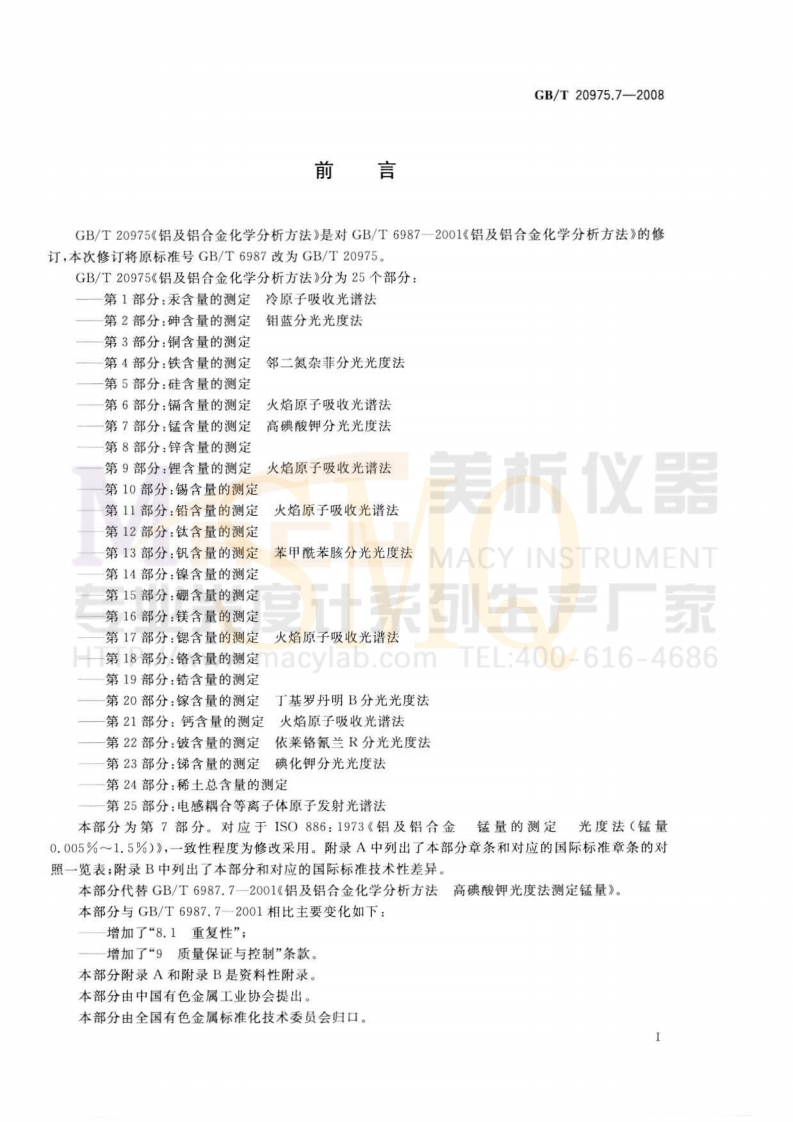 1CS77.120.10H12中华人民共和国国家标准GB/T20975.7-2008代替GB/T6987.7-2001铝及铝合金化学分析方法第7部分:锰含量的测定仪器高碘酸钾分光光度法NSTRUMENTMethods for chemical analysis of aluminium and aluminium alloys-Part 7:Determination of manganese contentHTTP:Potassium periodate spectrophotometric method616-4686(ISO 886:1973,Aluminium and aluminium alloysDetermination of manganese-Photometric method(Manganese content between 0.005 and 1.5%),MOD)2008-03-31发布2008-09-01实施中华人民共和国国家质量监督检验检疫总局中国国家标准化管理委员会发布数码防仿