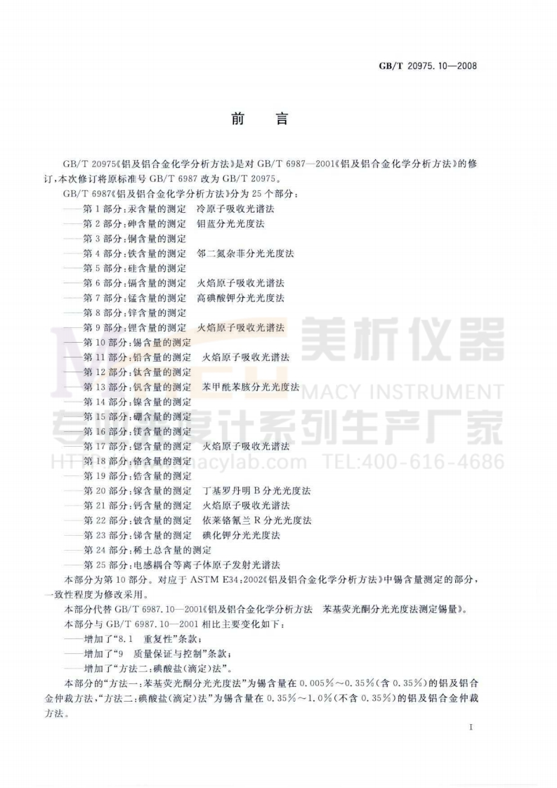 1CS77.120.10H12GB中华人民共和国国家标准GB/T20975.10-2008代替GB/T6987.10一2001铝及铝合金化学分析方法第10部分:锡含量的测定义器Methods for chemical analysis of aluminium and aluminium alloys-Part 10:Determination of tin content三厂家HTTP://www.macylab.com TEL:400-616-46862008-03-31发布资料专用章2008-09-01实施中华人民共和国国家质量监督检验检疫总局中国国家标准化管理委员会发布数码防伪