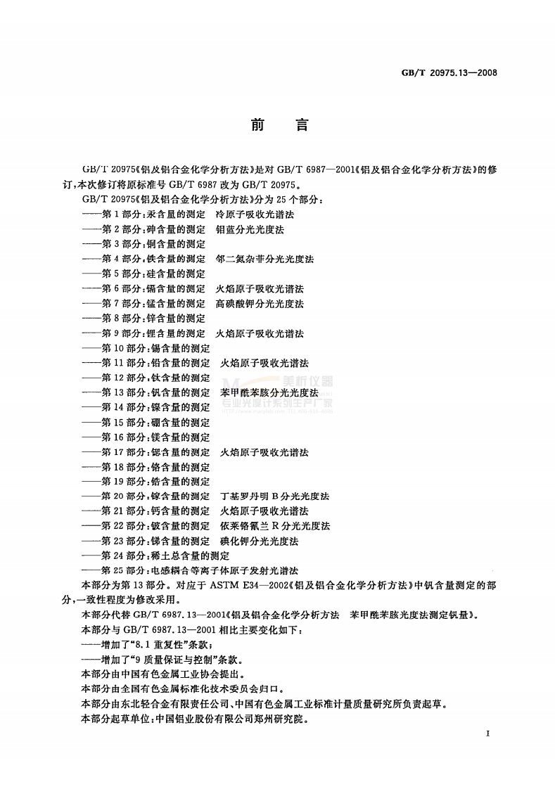 1CS77.120.10H12中华人民共和国国家标准GB/T20975.13-2008代替GB/T6987.13-2001铝及铝合金化学分析方法第13部分:钒含量的测定苯甲酰苯胲分光光度法Methods for chemical analysis of aluminium and aluminium alloys-Part 13:Determination of vanadium content-N-benzoyl-Nphenylhydroxylamine spectrophotometric method2008-03-31发布2008-09-01实施中华人民共和国国家质量监督检验检疫总局中国国家标准化管理委员会发布