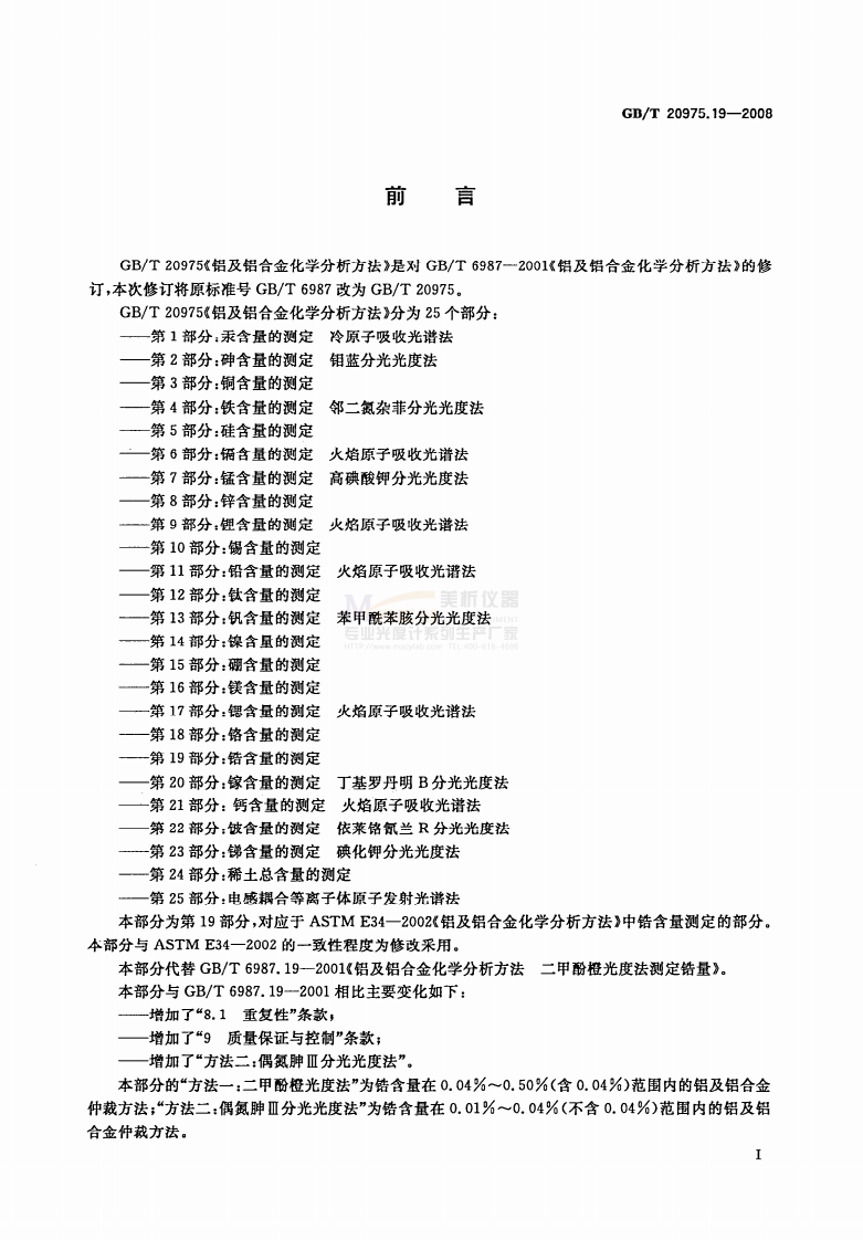 1CS77.120.10H12中华人民共和国国家标准GB/T20975.19-2008代替GB/T6987.19-2001铝及铝合金化学分析方法第19部分:锆含量的测定美析仪器Methods for chemical analysis of aluminium and aluminium alloys-Part 19:Determination of zirconium content2008-03-31发布2008-09-01实施中华人民共和国国家质量监督检验检疫总局中国国家标准化管理委员会发布
