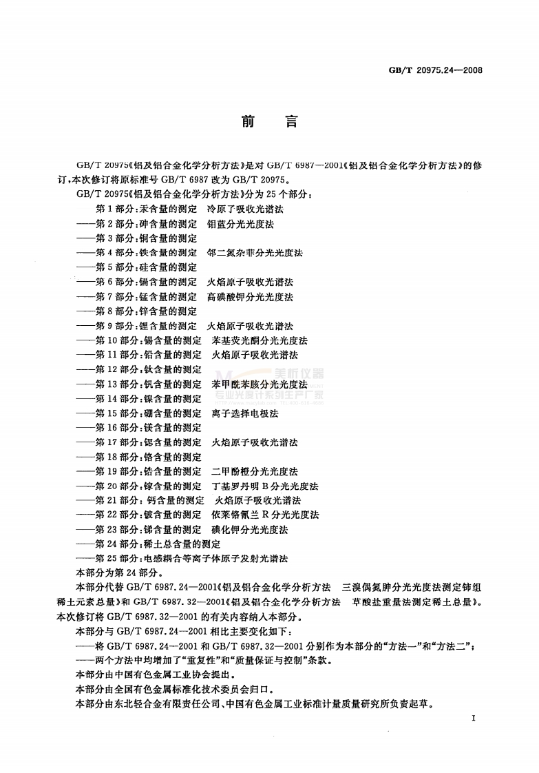 ICS77.120.10H12中华人民共和国国家标准GB/T20975.24-2008代替GB/T6987.24-2001,GB/T6987.32-2001铝及铝合金化学分析方法第24部分:稀土总含量的测定美析仪器Methods for chemical analysis of aluminium and aluminium alloys-Part 24:Determination of total rare earth contents2008-03-31发布2008-09-01实施中华人民共和国国家质量监督检验检疫总局中国国家标准化管理委员会发布