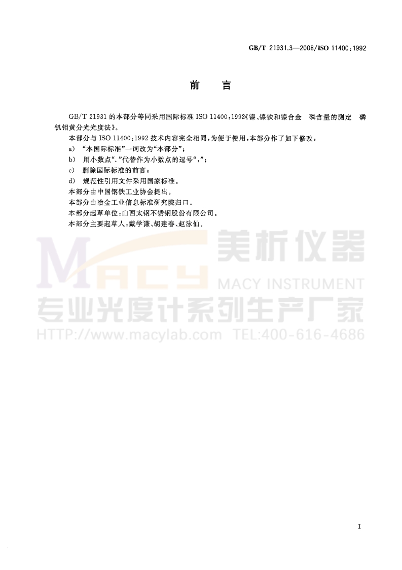 1Cs77.100H11G中华人民共和国国家标准GB/T21931.3一2008/IS011400:1992镍、镍铁和镍合金磷含量的测定磷钒钼黄分光光度法Nickel,ferronickel and nickel alloys-Determination of phosphorus content-Phosphovanoclonolybeate molecular absorption spectrometric method(IS011400:1992,IDT)HTTP://www.macylab.comEL:400-616-46862008-05-30发布2008-12-01实施中华人民共和国国家质量监督检验检疫总局中国国家标准化管理委员会发布