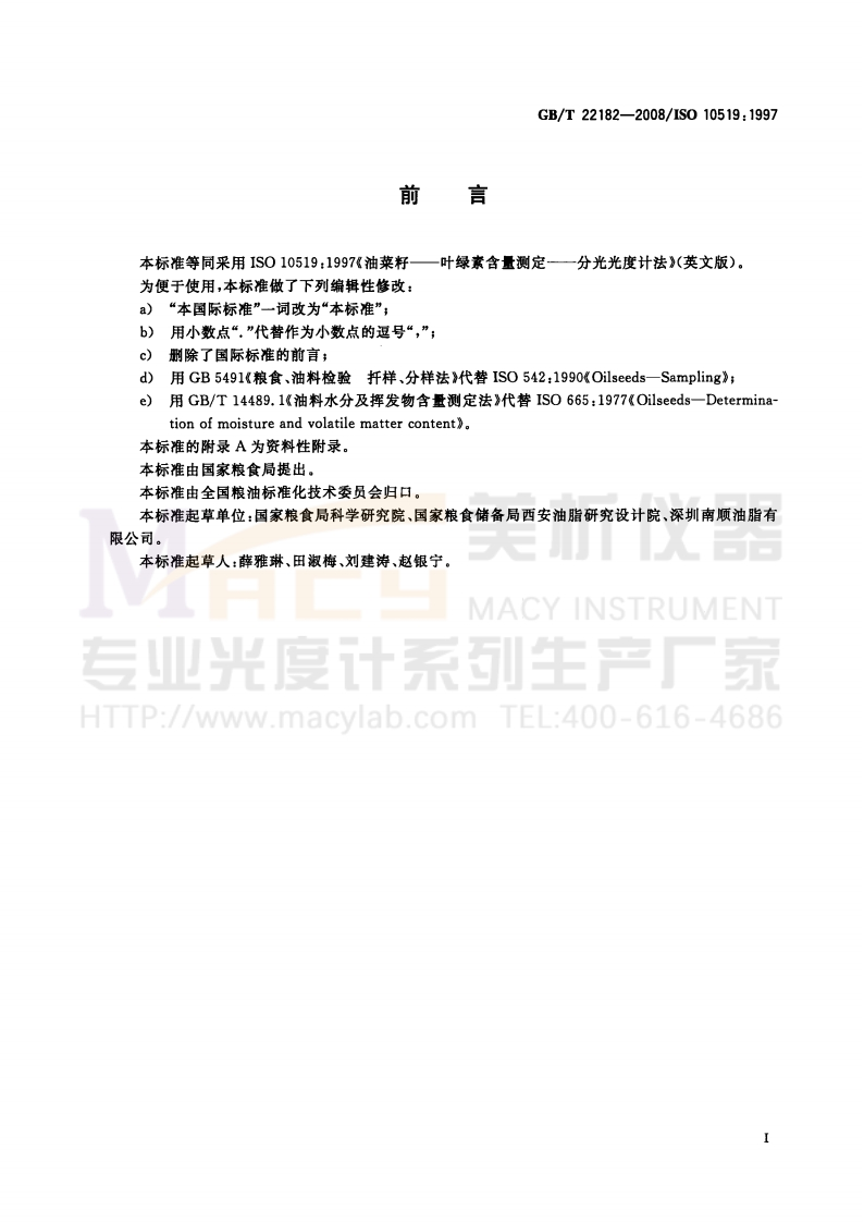 X467.20.20中华人民共和国国家标准GB/T22182-2008/IS010519:1997定义油菜籽叶绿素含量测定分光光度计法Rapeseed-Determination of chlorophyllRUMENT专亚光content-Spectrometric method家HTTP://www.macv(IS010519:1997,IDT)400-616-46862008-07-16发布2008-11-01实施中华人民共和国国家质量监督检验检疫总局中国国家标准化管理委员会发布