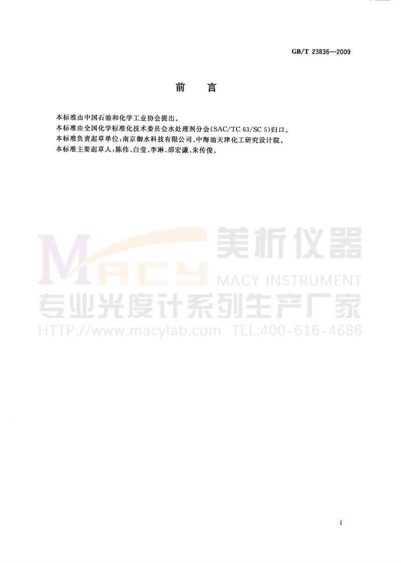ICs71.040.40G76中华人民共和国国家标准GB/T23836一2009工业循环冷却水中钼酸盐含量的测定硫氰酸盐分光光度法Determination of molybdate in industrial circulating cooling water-Spectrometric method using thiocyanateHTTP://www.macylab.com TEL:400-616-46862009-05-18发布2010-02-01实施中华人民共和国国家质量监督检验检疫总局中国国家标准化管理委员会发布