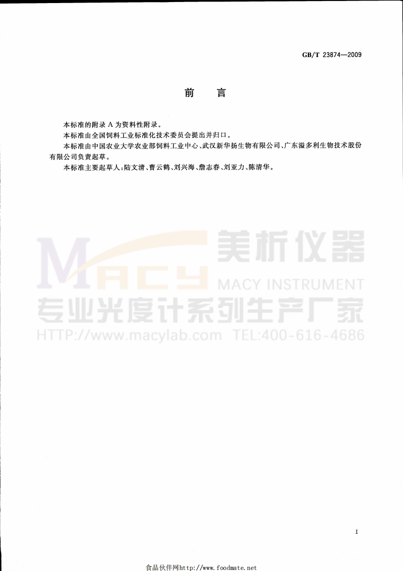 ICS65.120B46GB中华人民共和国国家标准GB/T23874-2009饲料添加剂木聚糖酶活力的测定分光光度法Determination of ylanase activity in feed additives专业光度Spectrophotometric methodHTTP://www.macylab.com TEL:400-616-46862009-05-26发布2009-10-01实施中华人民共和国国家质量监督检验检疫总局中国国家标准化管理委员会发布食品伙伴网http://www.foodmate.net