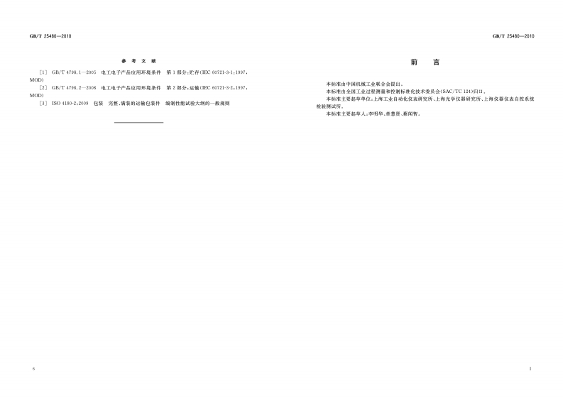 1cs19.020N 03GB中华人民共和国国家标准GB/T25480-2010仪器仪表运输、贮存基本环境条件及试验方法Basic environmental conditions and testing methodsfor transportation and storage of instruments中事人民共和国仅器侯表运输贮存基本环境条件及试哈方法25480-3018中国标液昌服忙出及爱行北章复英门外三星何t传16号整政星码:l00045网过w程,托.探.C由息进45529时8517548中国制准出颜壮桌皇乌血制厂印制各地新举书需经明无本0×12刻1/儿5印毫5字数且千字2011年3月第一眼11年】月第一戊年韩号,15206·141119定价160无2010-12-01发布2011-05-01实施如有印装差裙由本杜发行中心调换蓝机专有程双必究举报电话,01016B防3353中华人民共和国国家质量监督检验检疫总局中国国家标准化管理委员会发布