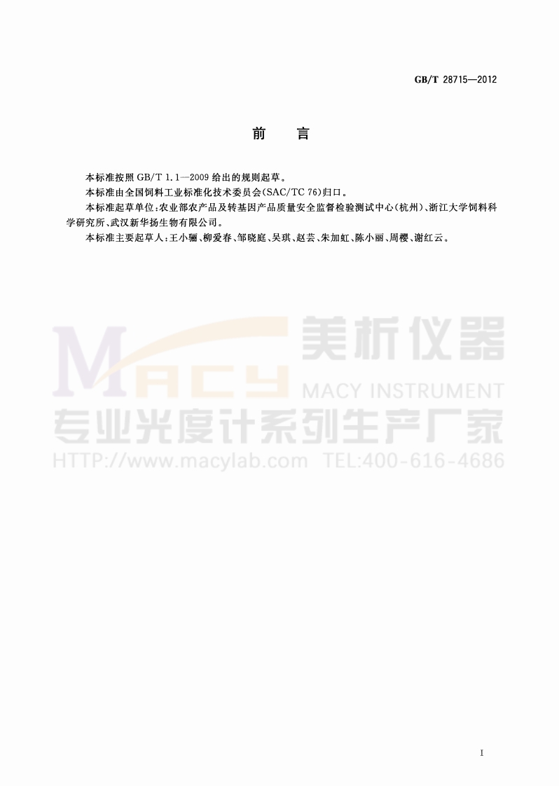 1D5.12WB46中华人民共和国国家标准GB/T28715-2012饲料添加剂酸性、中性蛋白酶活力的测定分光光度法MACY INSTRUMENTDetermination of acidic and neutral protease activity in feed additives-Spetrophotometric methodHTTP://www.macylab.com TEL:400-616-46862012-09-03发布2013-02-01实施中华人民共和国国家质量监督检验检疫总局中国国家标准化管理委员会发布