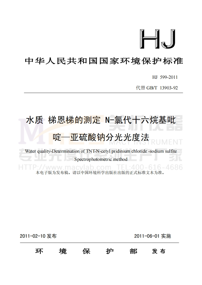HJ中华人民共和国国家环境保护标准HⅡ599-2011代替GB/T13903-92水质梯恩梯的测定-氯代十六烷基吡啶一亚硫酸钠分光光度法RUMENTWater quality-Determination of TNT-N-cetyl pridinium chloride-sodium sulfiteSpectrophotometric method2HTTP://www.macylab.com·400-616-4686本电子版为发布稿。请以中国环境科学出版社出版的正式标准文本为准。2011-02-10发布2011-06-01实施环境保护部发布