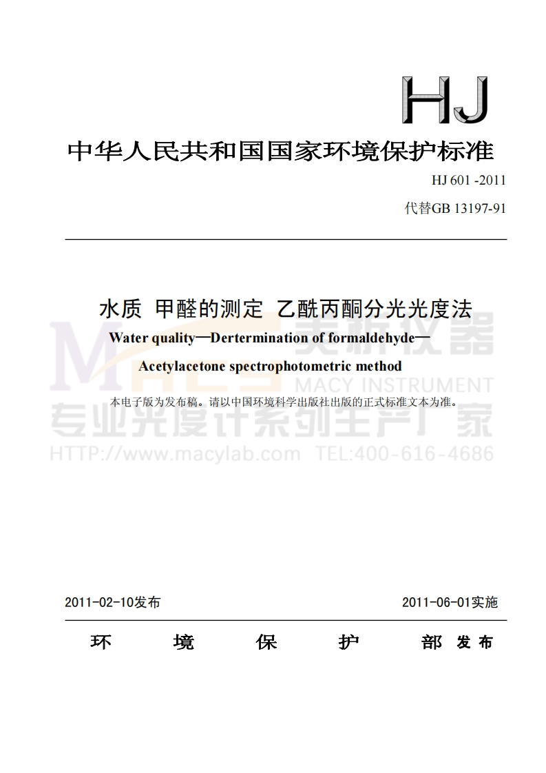 HJ中华人民共和国国家环境保护标准HJ601-2011代替GB13197-91水质甲醛的测定乙酰丙酮分光光度法Water quality-Dertermination of formaldehydeAcetylacetone spectrophotometric methodINSTRUMENT本电子版为发布稿。请以中国环境科学出版社出版的正式标准文本为准。HTTP://www.macylab.com TEL:400-616-46862011-02-10发布2011-06-01实施环境保护部发布