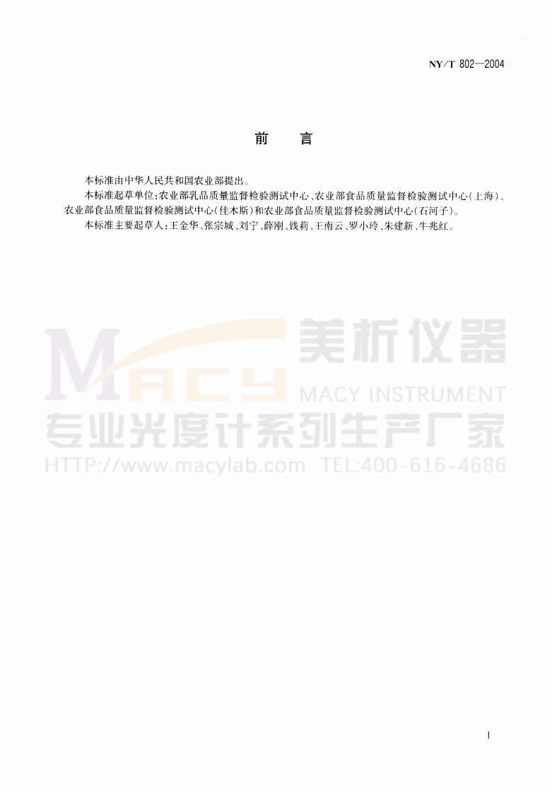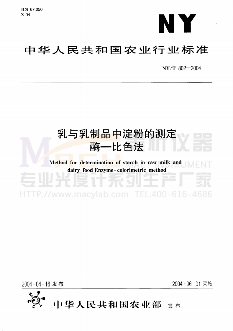 ICS67.050X04NY中华人民共和国农业行业标准NY/T802-2004乳与乳制品中淀粉的测定酶一比色法Method for determination of starch in raw milk anddairy food Enzyme-colorimetric method专业光度T宗工产厂家HTTP://www.macylab.com TEL:400-616-46862004-04-16发布2004-06-01实施中华人民共和国农业部发布