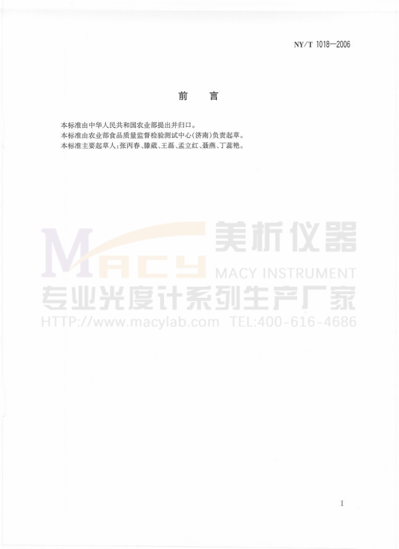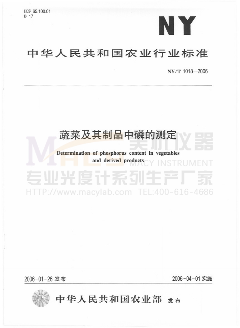 ICs65.100.01B17NY中华人民共和国农业行业标准NY/T1018-2006蔬菜及其制品中磷的测定器Determination of phosphorus content in vegetablesand derived productsCY INSTRUMENT专业光度计系列生产厂家HTTP://www.macylab.com TEL:400-616-46862006-01-26发布2006-04-01实施中华人民共和国农业部发布