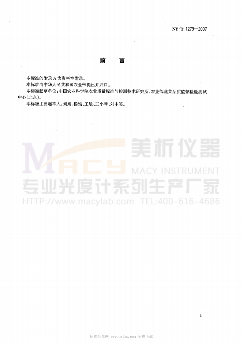 NYT1279-2007蔬菜、水果中硝酸盐的测定紫外分光光度法348072@abc2个月前发布关注私信0.22MB5页03211NYT1279-2007蔬菜、水果中硝酸盐的测定紫外分光光度法此内容为付费资源,请付费后查看¥15¥23黄金会员免费钻石会员免费立即购买您当前未登录!建议登陆后购买,可保存购买订单付费资源 第1页 / 共5页 第2页 / 共5页 试读已结束,还剩3页,您可下载完整版后进行离线阅读 © 版权声明文章版权归作者所有,未经允许请勿转载。THE END标准规范 文本预览 ICs65.080.01B05NY中华人民共和国农业行业标准NY/T1279-2007蔬菜、水果中硝酸盐的测定紫外分光光度法仪器Determination of Nitrate in Vegetables and FruitsUV-spectrophotometer专业光度采生产厂家HTTP://www.macylab.com TEL:400-616-46862007-04-17发布2007-07-01实施中华人民共和国农业部发布 查看更多 收起部分 喜欢就支持一下吧点赞11 分享QQ空间微博QQ好友海报分享复制链接收藏