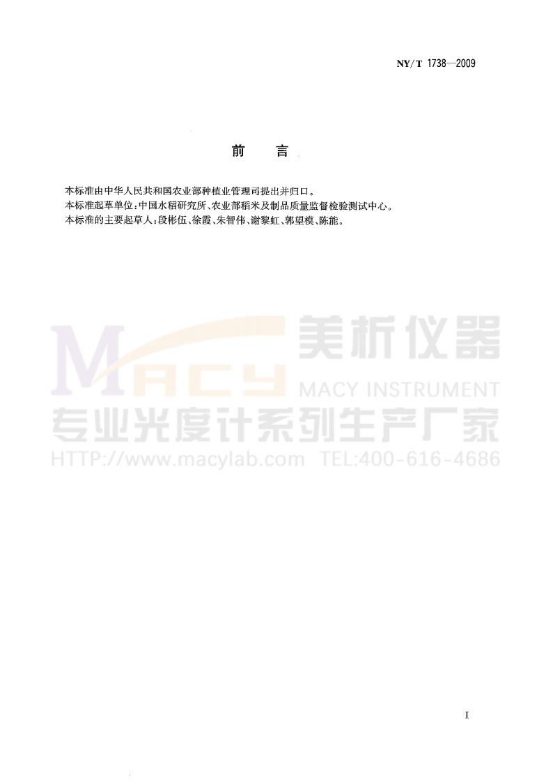 ICs67.050X04NY中华人民共和国农业行业标准NY/T1738-2009农作物及其产品中磷含量的测定分光光度法MENTDetermination of phosphorus content in crops and derived productsspectrophotometryHTTP://www.macylab.com TEL:400-616-46862009-04-23发布2009-05-20实施中华人民共和国农业部发布