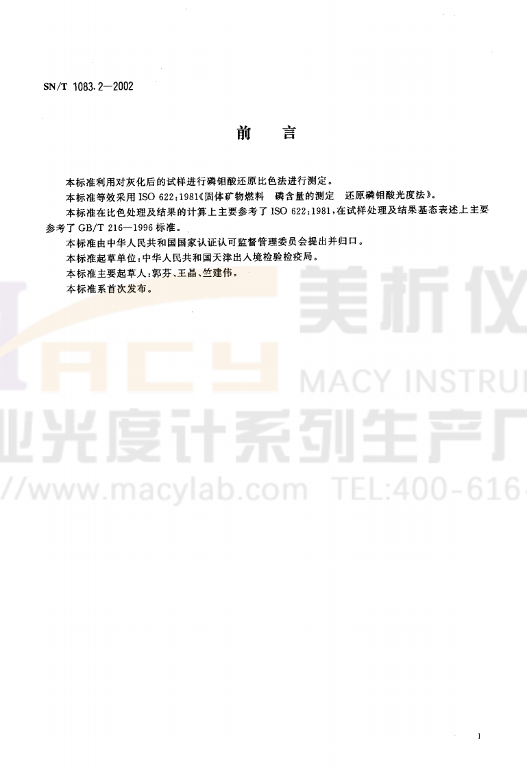 SNT1083.2-2002焦炭中磷含量的测定348072@abc4个月前发布关注私信0.13MB5页022SNT1083.2-2002焦炭中磷含量的测定此内容为付费资源,请付费后查看¥15¥23黄金会员免费钻石会员免费立即购买您当前未登录!建议登陆后购买,可保存购买订单付费资源 第1页 / 共5页 第2页 / 共5页 试读已结束,还剩3页,您可下载完整版后进行离线阅读 THE END标准规范 文本预览 SN中华人民共和国出入境检验检疫行业标准SN/T1083.2-2002eqv IS(0622:1987行焦炭中磷含量的测定Determination of phosphorous content in cokeINSTRU卫光度计系列生产/www.macylab.com TEL:400-6162002-03-15发布2002-09-01实施中华人民共和国国家质量监督检验检疫总局发布 查看更多 收起部分 喜欢就支持一下吧收藏