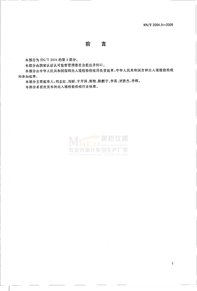 SN中华人民共和国出入境检验检疫行业标准SN/T2004.3-2005电子电气产品中六价铬的测定第3部分:二苯碳酰二肼分光光度法Determination of Chromium(M)in electrical and electronic equipment-Part 3,1,5-Diphenylcarbohydrazide spectrophotometric method2005-07-18发布2006-01-18实施中华人民共和国国家质量监督检验检疫总局发布【数到防伤习