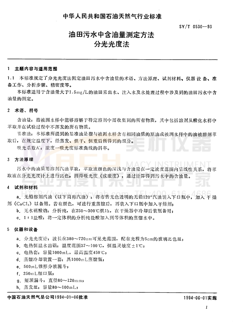 SYT0530-1993油田污水中含油量测定方法分光光度计法348072@abc4个月前发布关注私信0.41MB5页042SYT0530-1993油田污水中含油量测定方法分光光度计法此内容为付费资源,请付费后查看¥15¥23黄金会员免费钻石会员免费立即购买您当前未登录!建议登陆后购买,可保存购买订单付费资源 第1页 / 共5页 第2页 / 共5页 试读已结束,还剩3页,您可下载完整版后进行离线阅读 THE END标准规范 文本预览 SY中华人民共和国石油天然气行业标准SY/T0530-93油田污水中含油量测定方法分光光度法片昌MACY INSTRUMENT专业光度计系列生产厂家HTTP://www.macylab.com TEL:400-616-46861994-01-06发布1994-06-01实施中国石油天然气总公司发布 查看更多 收起部分 喜欢就支持一下吧收藏