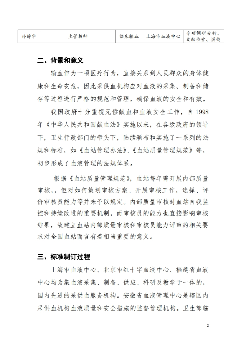 中国输血协会团体标准《血站质量管理体系审核指南》编制说明一、任务来源在国家卫生和计划生育委员会法制司委托下,2015年4月28日,上海市血液中心、福建省血液中心、北京市红十字血液中心、卫生部临床检验中心、安徽省血管中心和中国医学科学院输血研究所承担了《血站质量管理体系审核指南》的编制任务。该项目编号为:20151602.2018年8月受中国输血协会血液质量专业委员会委托承担《血站质量管理体系审核指南》的编制任务,项目编号为P2018-014。主要参与人员及承担的工作如下:姓名职称/职务专业单位承担工作徐忠副主任技师/质量与法规部部长生物化学上海市血液中心项目总负责、总撰稿徐蓓副主任技师/质量与法规部副部长临床检验上海市血液中心专项调研分析、文献检索、撰稿朱永明血液管理政策指导、架构研究员/党委书记上海市血液中心设计、撰稿钱开诚研究员/输血研究所所长临床输血上海市血液中心专项调研分析、文献检索、撰稿郭永建主任医师/中心主任临床输血福建省血液中心专项调研分析、文献检索、撰稿北京市红十字血专项调研分析、王鸿捷主任技师/中心副主任临床输血液中心文献检索、撰稿实验室诊卫生部临床检验专项调研分析、王露楠研究员/免疫室副主任断中心文献检索、撰稿安徽省血液管理专项调研分析、范文安主任技师/中心副主任临床输血中心文献检索、撰稿中国医学科学院刘忠主任技师/所长临床输血专项调研分析、输血研究所文献检索、撰稿1