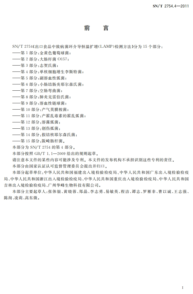 SN中华人民共和国出入境检验检疫行业标准SN/T2754.4-2011出口食品中致病菌环介导恒温扩增(LAMP)检测方法第4部分:单核细胞增生李斯特菌Loop-mediated isothermal amplification detection method for pathogensin export food-Part 4:Listeria monoc ytogenes2011-02-25发布2011-07-01实施中华人民共和国国家质量监督检验检疫总局发布