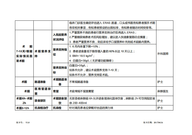 免责和版权声明:本临床路径内容仅作为学术研究目的的参考资料,发布方不为其内容的真实性和有效性负任何责任,使用临床路径即表示了解并接受此约定;:此外,未经发布方的书面同意,任何人不可将本临床路径内容用于约定以外的任何其它目的包括商业目的,否则会被视为侵犯发布方的版权而受到法律追究。胆囊切除术ERAS实施流程实施时间实施项目项目内容绍负责人护士/外科入院生活方式教通过门诊宣教,宣传小册子等,告知患者戒烟戒酒育医师1所有患者在术前应接受专门的咨询服务,将手术和麻醉过程对患者进行宣教:患者教育评2.行肺功能锻炼(爬楼梯、吹气球);如何进行有效咳漱排痰;术后进术前一个月估入院宣教及食(50次咀丽法)介绍;如何预防误吸(床头抬高30度、进食后下床护理/优化活动);注意口腔卫生(刷牙、漱口液);做好对患者及其家属的教育,护士(4周)身体情况轻忠者的精神压力,并告知术后康复的详细步骤。3.日间预约后至手术日前如有胆囊炎发作,应及时告知主诊医师,注意皮肤巩膜黄染,如有停止日间手术程序,月经期不宜手术,入手术室前排尽小便,去除所有配饰假牙版本号:V1.0版本日期:20170426
