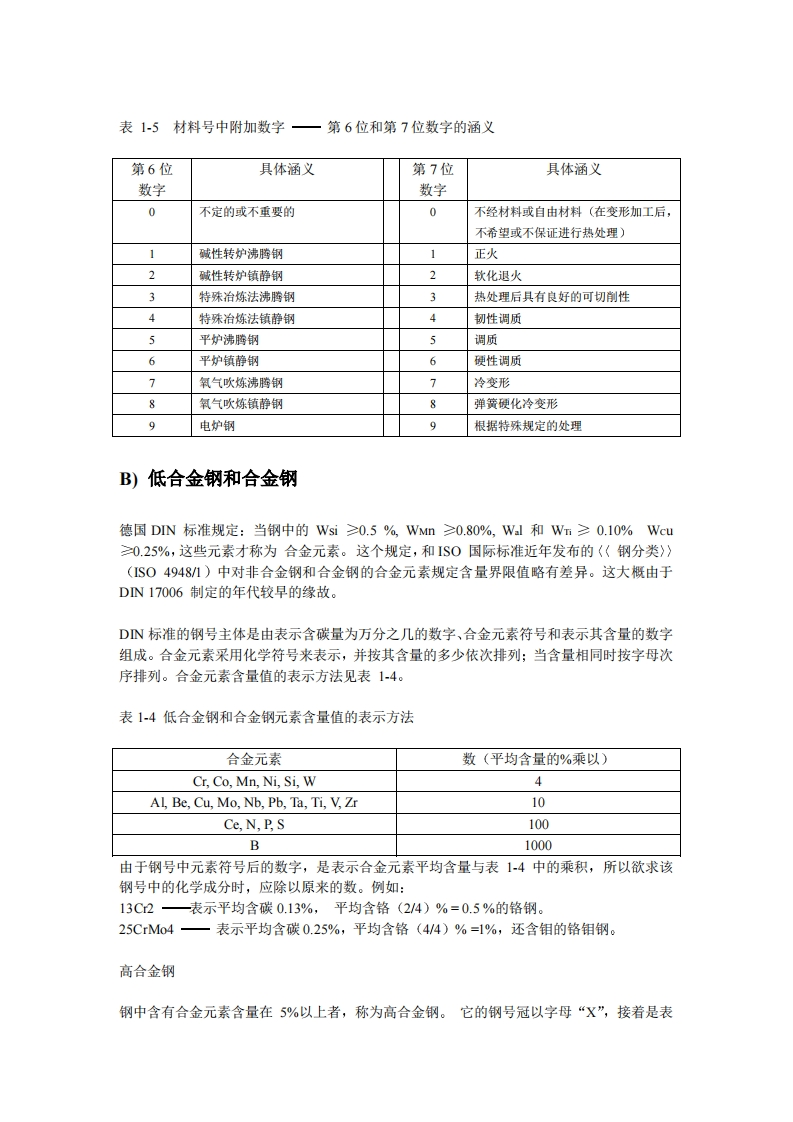 A)德国DN17007系统的数字材料号表示方法介绍1.材料号(W-Nr。)系由7位数字组成,数字表示的含义如下:XXXXXX第1位:类别第25位:钢种组别第67位:附加数字:钢的制造方法和热处理状态2.材料号第1位、数字中:0一生铁和铁合金;1一钢和铸钢;2一重金属(除钢铁外):3一轻金属;4~8一非金属材料。3.在钢和铸钢的材料号中,其中主要的是第2位和第3位的数字,表示钢种组别,其中:00~06一碳素钢,其中“01”的大部分钢种,现已并入“00”组。90~96一碳素钢的专用钢。07和97一硫、磷含量较高的易切削钢。08~09,98~99一硅,锰含量较高的钢种。其中“08”的大部分钢种,现己并入“04”和“05”组;“09”的一部分钢种,现已并入“06”组。10一特殊物理性能的碳素钢及电工纯铁。11~12一优质碳素工具钢。15~18一碳素工具钢。20-28合金工具钢(包括铸钢)32~33—高速工具钢。34-35—耐磨钢和轴承钢。36~39一具有特殊物理性能的材料(包括磁性材料)。4045—不锈钢。4748和49一耐热钢和高温材料。50~85一合金结构钢。88一硬质合金此外,尚有一些数字如“13”、“14”、“55”、“64”…等等,是暂予保留的,以便今后用于新发展的材料。4.材料号第4位和第5位数字无一定规律,或按其碳含量或按合金含量区分。5.材料号第6位和第7位为附加数字,一般在标准中不子标出,但亦常用。第6位数字用以表示钢的治炼和浇注工艺;第7位用以表示热处理状态,它们的具体涵义见表1-5。
