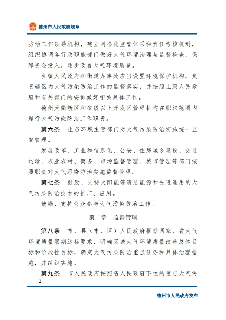 德州市人民政府规章德州市大气污染防治管理规定(2016年7月21日德州市人民政府令第2号发布根据2022年11月19日《德州市人民政府关于修改〈德州市大气污染防治管理规定〉的决定》修正)第一章总则第一条为了保护和改善大气环境,防治大气污染,保障公众健康,推进生态文明建设,根据《中华人民共和国环境保护法》《中华人民共和国大气污染防治法》《山东省大气污染防治条例》等法律、法规,结合本市实际,制定本规定。第二条本规定适用于本市行政区域内大气污染防治及其监督管理活动。第三条大气污染防治遵循生态优先、防治结合、综合治理、政府主导、公众参与的原则。第四条大气污染防治坚持以改善大气环境质量为目标,以建设京津冀南部重要生态功能区为导向,落实绿化责任制,加快城市绿地、农田防护林等绿色生态屏障建设,加强对燃煤、扬尘、工业、机动车、农业等大气污染的综合防治,对颗粒物、二氧化疏、氮氧化物、挥发性有机物、氨、臭氧等大气污染物和温室气体实施协同控制。第五条市、县(市、区)人民政府对本行政区域内的大气环境质量负责,制定大气污染防治规划,成立大气污染一1一德州市人民政府发布